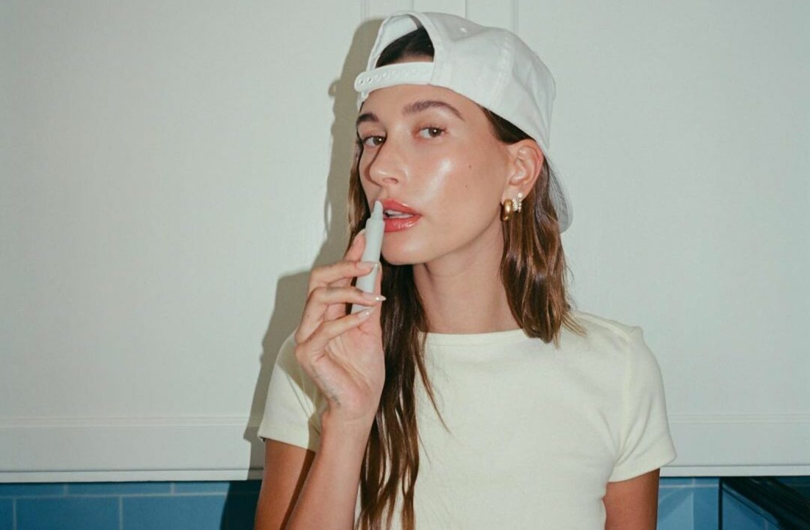 Hailey prend une douche et enchaîne avec sa skincare routine. Pour ce faire, elle nettoie d’abord son visage, puis utilise le serum de sa marque Rhodes – il lui apporte de l’hydratation et réveille sa peau. Et elle termine par une crème SPF et un baume à lèvres.
